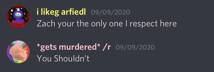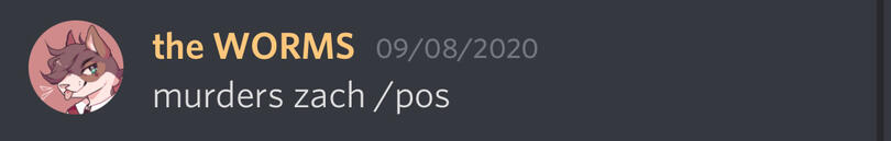 [IMG Description. Discord screenshot using the dark theme. Dated 09/08/2020, it is from a person nicknamed "the WORMS" in orange and reads "murders zach /pos" END DESCRIPTION.]
