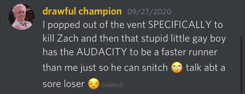 [IMG Description. Discord screenshot using the dark theme. Dated 09/27/2020, it is from a person nicknamed "drawful champion" in mustard and reads "I popped out of the vent SPECIFICALLY to kill Zach and then that stupid little gay boy has the AUDACITY to be a faster runner than me just so he can snitch 🙄 talk abt [sic] a sore loser 😒" END DESCRIPTION.]