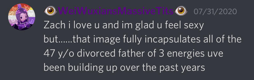 [IMG Description. Discord screenshot using the dark theme. Dated 07/31/2020, it is from a person nicknamed "👁️WeiWuxiansMassiveTits👁️" in a dark purple and reads "Zach i love u and im glad u feel sexy but......that image fully incapsulates all of the 47 y/o divorced father of 3 energies uve been building up over the past years" END DESCRIPTION]