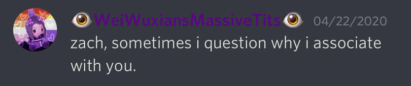 [IMG Description. Discord screenshot using the dark theme. Dated 04/22/2020, it is from a person nicknamed "👁️WeiWuxiansMassiveTits👁️" in a dark purple and reads "zach, sometimes i question why i associate with you." END DESCRIPTION]