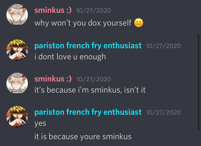 [IMG Description. Discord screenshot using the dark theme. Dated 10/27/2020, it is a conversation between two people, one nicknamed "sminkus :)" in pink and the other nicknamed "pariston french fry enthusiast" in cyan; it reads as follows: